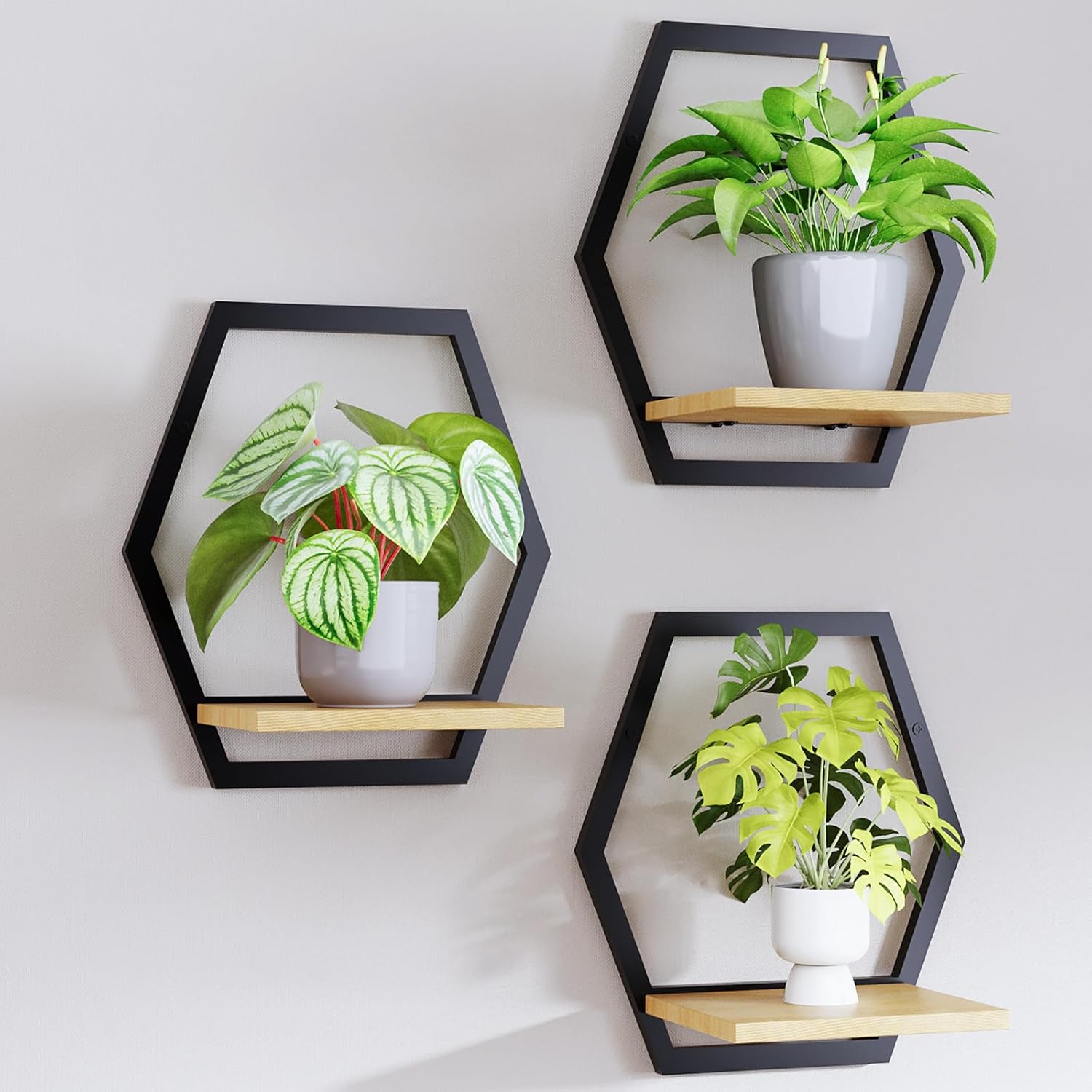 3 Pack Solid Wood & Heavy Duty Metal Wall Plant Stands,9 inch Natural Wood Shelf, Boho Arch Hanging Planter for Indoor 25 LB Load for Plants, Flowers, Herbs Black