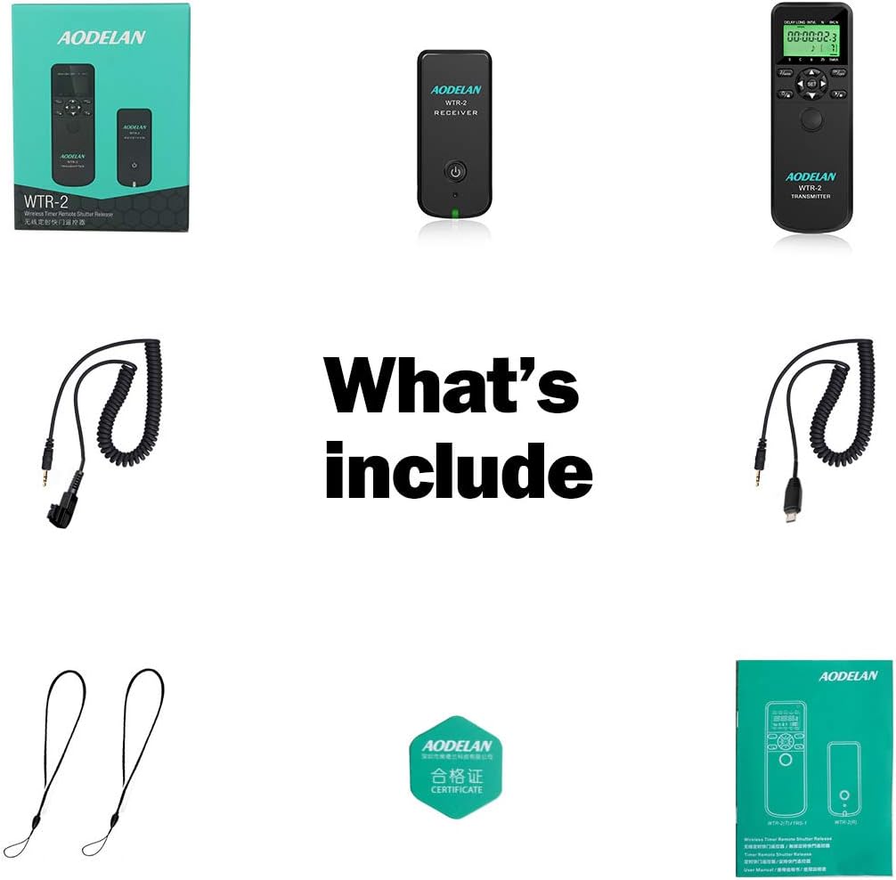 • AODELAN shutter release timer includes a Timer and a Receiver, can work as a timer and remote shutter release. Use 2.4GHz wireless transmission, distance up to 60M. With LCD display, easy to operate on a sunny day or in the dark