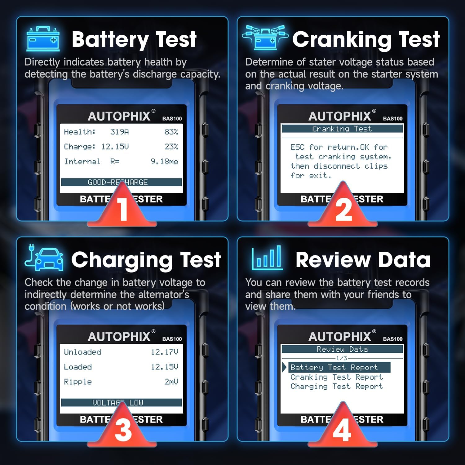 • AUTOPHIX BAS100 car battery tester can quickly determine the degree of battery aging and remaining power through State of Health (SOH) and State of Charge (SOC) testing. It can also perform a cranking test to verify if the battery has sufficient power to start the engine. At the same time, it provides charging test to check if the Charging System works normally.