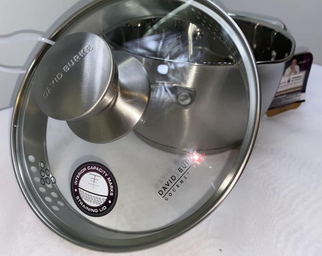 David Burke Regency II cookware features a commercial grade heavy gauge stainless steel body. Thicker base for accelerated and even heating. Interior capacity marks simplify cooking preparation. Stainless handles are riveted for durability, control and safe handling. Oven safe to 400 degrees F (glass lid to 350 degrees F)