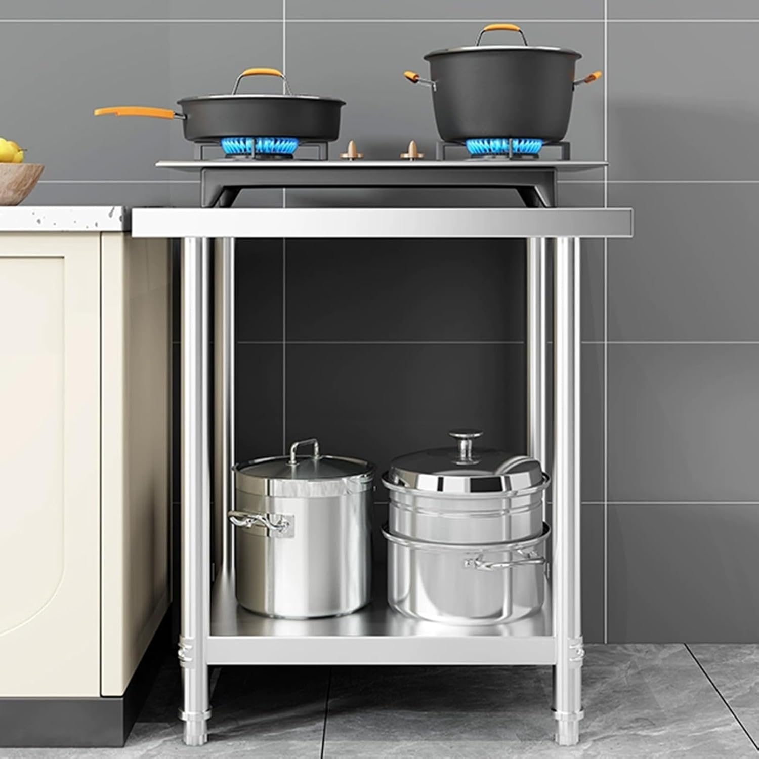 Double Workbench Kitchen Sturdy Metal Table Multifunctional Prep Table Adjustable Shelves Commercial Household Cooktop Shelves Stainless Steel Workbench