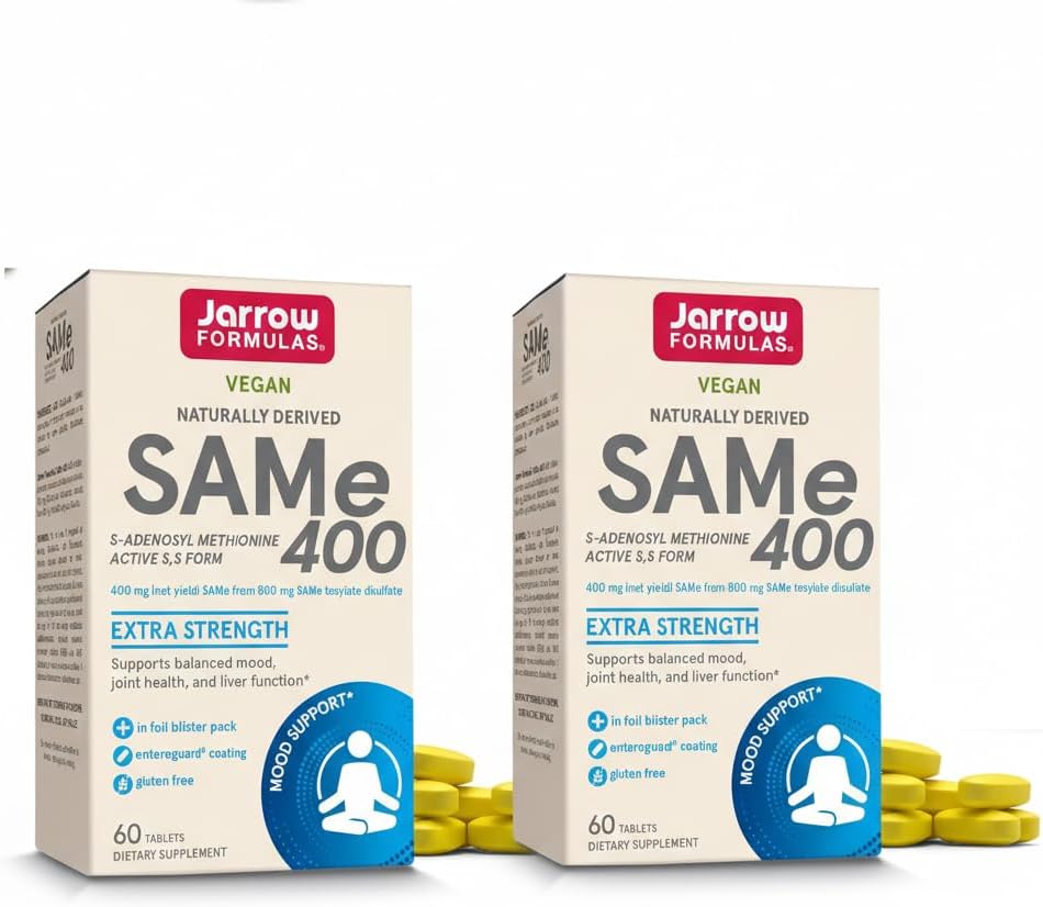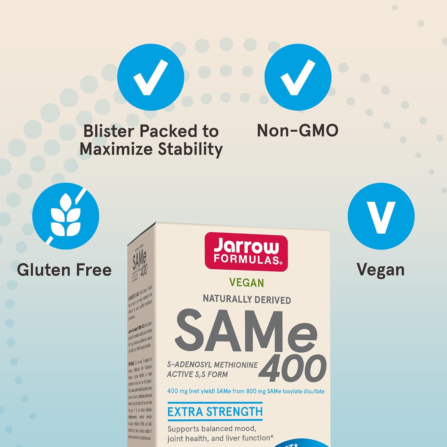 Jarrow Formulas SAMe provides SAM-e (S-Adenosyl Methionine), a naturally derived compound that plays a role in supporting various biochemical systems in the body.* Each tablet of Jarrow Formulas SAM-e provides 400 mg of SAM-e to provide benefits. Jarrow Formulas SAM-e offers a wide array of benefits that can support various aspects of your health and well-being.* SAM-e supports joint health, and liver function.* Jarrow Formulas SAM-e is non-GMO, vegan-friendly, and gluten free, making it an ideal choice for those with dietary restrictions.* These tablets are also wheat free, soy free, dairy free, egg free, fish/shellfish free, peanut/nut free, and sesame free.* Taking Jarrow Formulas SAM-e is simple and convenient. Adults should take 1 tablet per day on an empty stomach or as directed by your qualified healthcare professional.* At Jarrow Formulas, we aren't your typical vitamin company. We believe everyone has the right to feel good in their own body. Jarrow Formulas original goal has always remained the same: To design superior dietary supplements that help empower individuals to take charge of their own health.*These statements have not been evaluated by the Food and Drug Administration. This product is not intended to diagnose, treat, cure or prevent any disease.