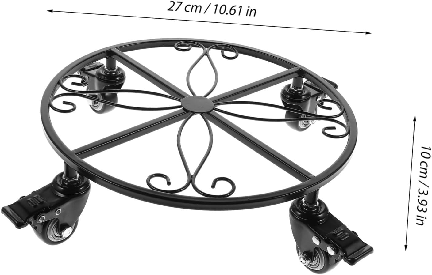 Package List 1 x flower pot stand Characteristics - Material: Iron - Size: Approx. 27.00X27.00X10.00cm/10.61X10.61X3.93inch - Color: Black - Note: 27cm in diameter and 10cm in heightGoods InformationCrafted from iron, this wrought iron flower pot moving rack combines durability with elegant design that complements garden and lawn care environments. Its universal wheel system ensures smooth relocation of plant containers, reducing effort while maintaining floor cleanliness. Measuring 27cm in diameter and 10cm in height, the stand accommodates various plant pots including succulents, offering a stylish yet practical base. The fine craftsmanship and sturdy iron material provide support, making it versatile accessory for patios, balconies, or indoor gardens. Beyond functionality, its sleek black finish and creative shape enhance visual appeal, fitting seamlessly into diverse planting setups. This flowerpot caddy is ideal for gardeners seeking ease of mobility and attractive display solution, facilitating maintenance and aesthetic arrangement of plant collections throughout changing seasons. Whether for hobbyists or professional gardeners, the stand's practical design and quality construction help transform gardening tasks into smoother, more enjoyable experiences From Mipcase was created to bring practical elegance to gardening routines, for blending durability with style. Our iron flower stands embody craftsmanship and functionality, offering plant lovers smooth mobility and refined aesthetics. Enhance your with Mipcase’s dedication to enduring design and effortless care