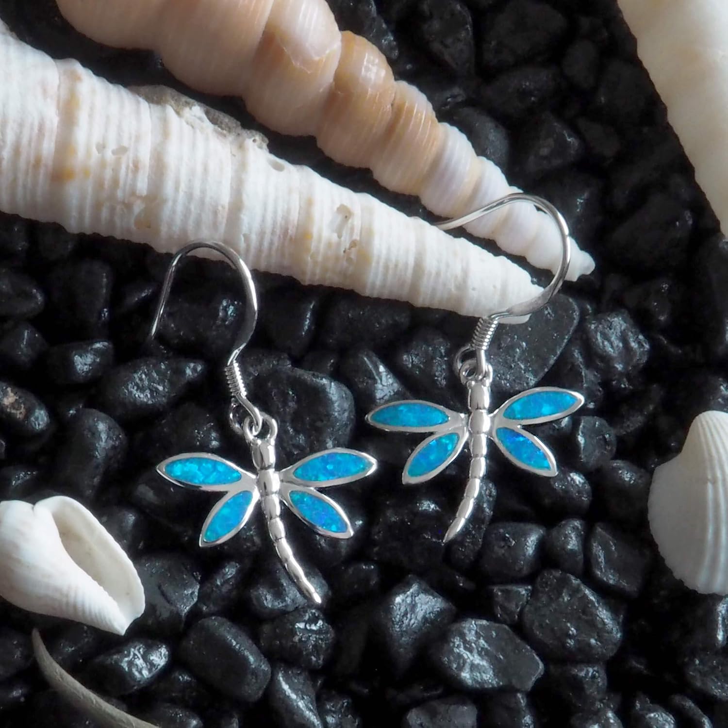 Dainty dragonfly dangle earrings with french wire. Beautifully aqua colored synthetic opal is reminiscent of our tropical blue waters. Earring measures 1/2 inch tall and 5/8 inch (0.63 inch) wide. High polished for easy care and rhodium plated sterling silver for superior quality and shine as well as anti-tarnish properties.Please note the picture shown is not a true depiction of how large/small the items is. Please refer to the measurements for accurate size. Mahalo~
