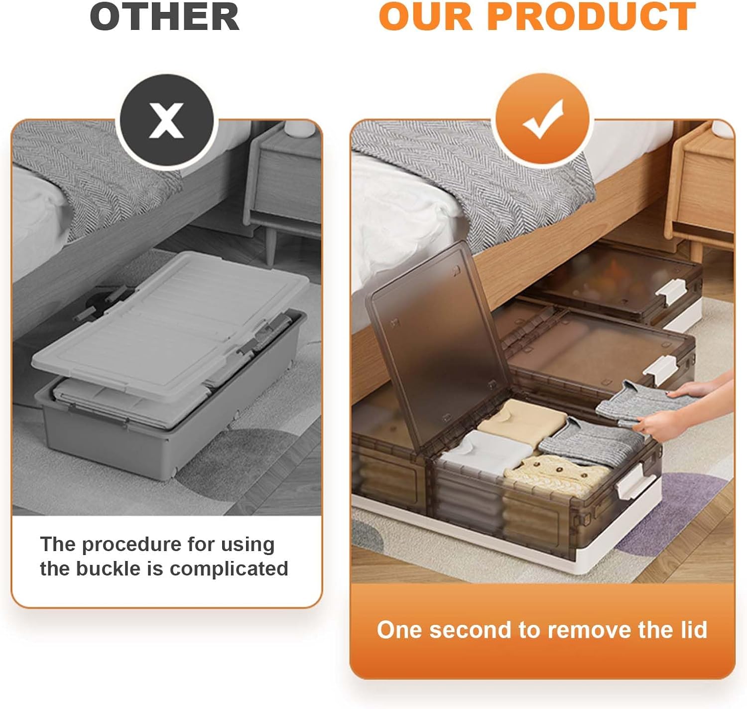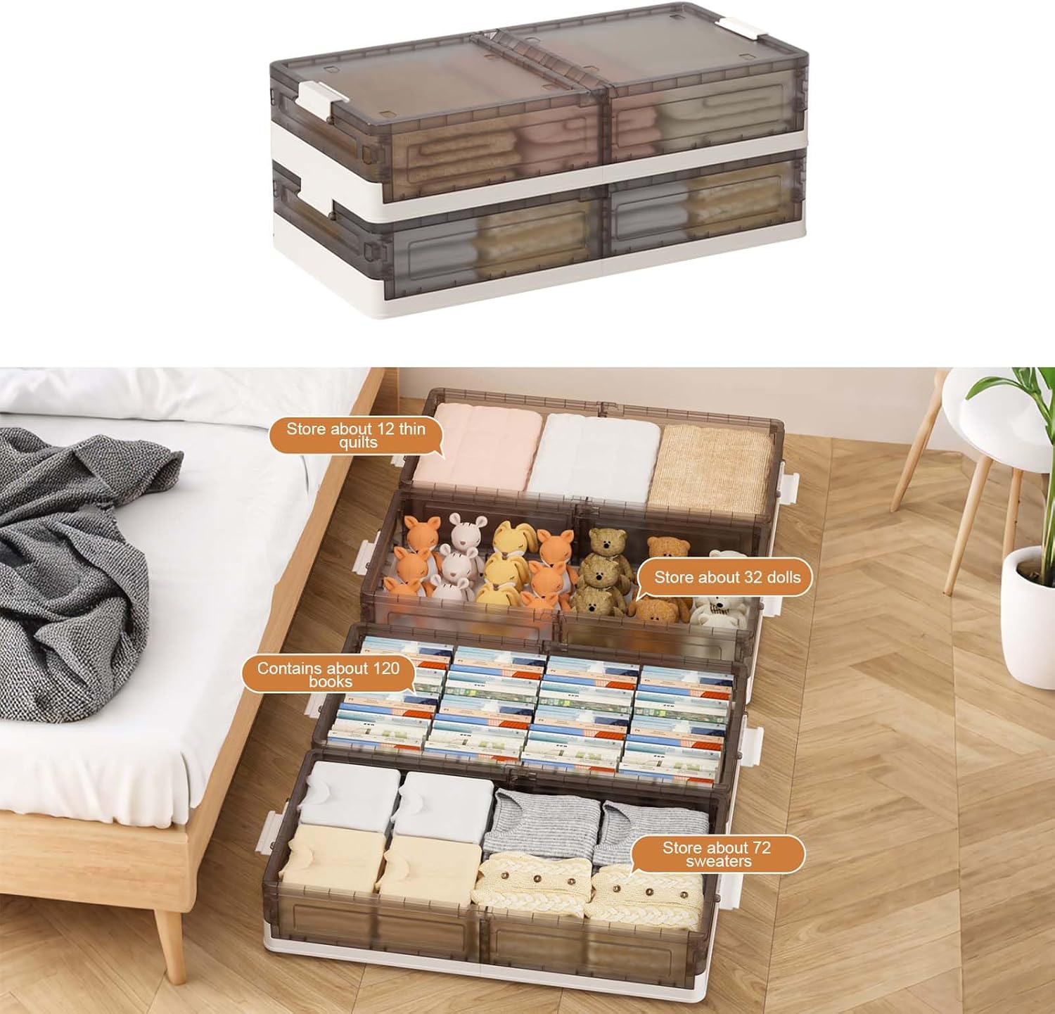 Product Description: The perfect solution for organizing your bedroom, this Foldable Bed Bottom Storage Box is made of durable plastic. Designed with mobility in mind, it features a pulley system for easy transport and can be carried with ease. With an internal capacity of 43.5L, it provides ample space for storing various items. Specifications include unfolded dimensions of 81cm x 40.5cm x 17.5cm, with lock dimensions of 83.5cm x 40.5cm x 17.5cm, and folded dimensions of 81cm x 40.5cm x 10cm. The storage box boasts a simple design and is available in two color options: Cream White and Transparent Brown. It is a multi-purpose, foldable, and removable storage solution that fits seamlessly under your bed.