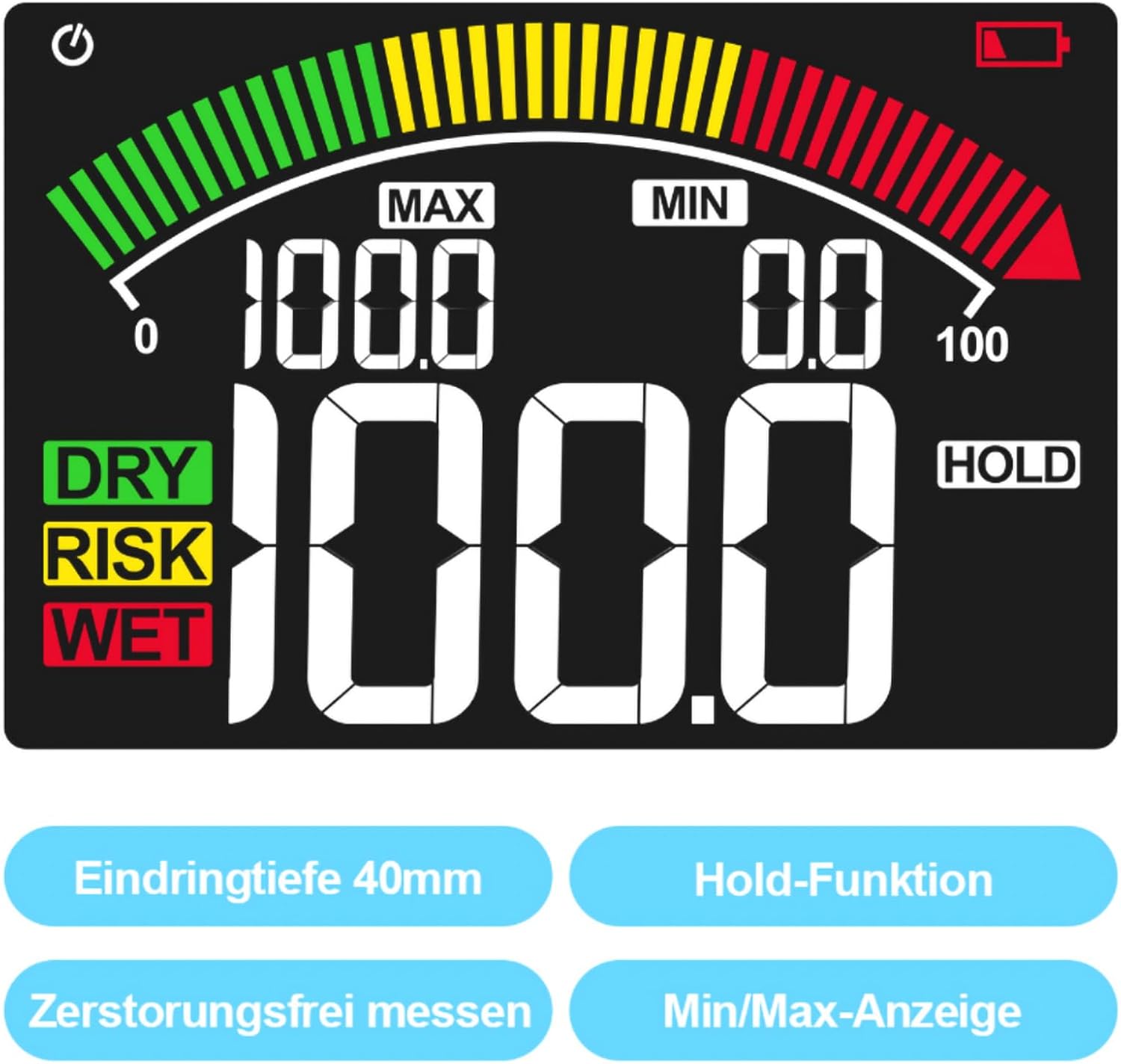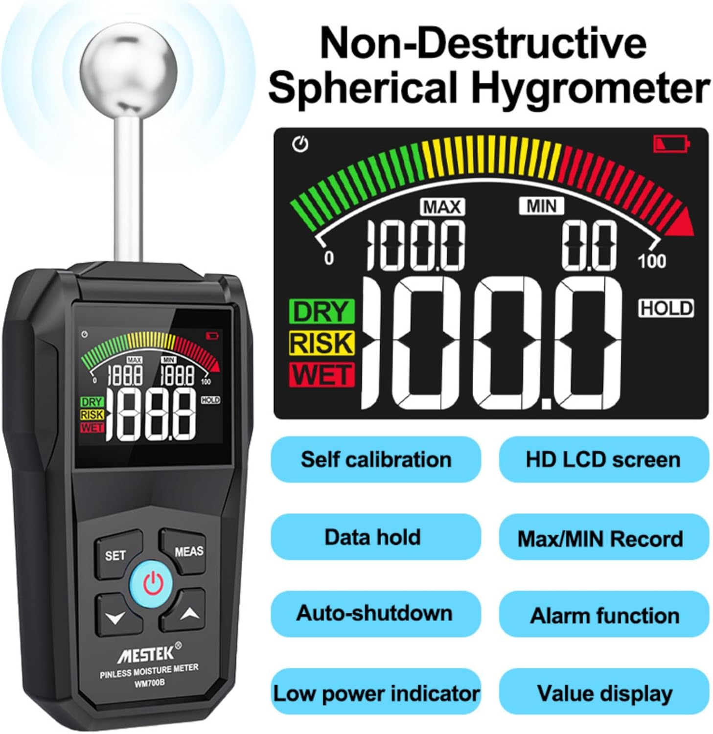 The Pinless Wood Moisture Meter is a professional-grade tool with a high-precision alloy probe and advanced processing chip that quickly and accurately measures the moisture content of drywall, wood, and masonry without the need to insert electrodes or probes, thus protecting the object surface. Its simple and easy-to-use design is equipped with a large-screen LCD display and color display bar to make the measurement results intuitively visible; it also has humidity alarm and automatic shutdown functions to ensure reliability and durability. In addition, the soft rubber shell design ensures durability, while included accessories and comprehensive after-sales guarantee provide users with a more complete user experience and reliable support