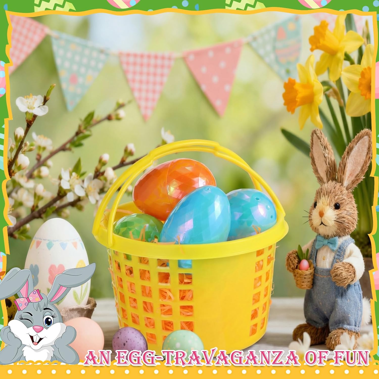 • Create a Festive Atmosphere: the Easter baskets are proper for Easter parties, goody bags, rewards and more, and they can also add some Easter colors to your living room, bedroom, and dining room; You can fill the Easter baskets with snacks and small treats, such as fudge, eraser, bunny, candy and chocolate to make your own Easter gift
