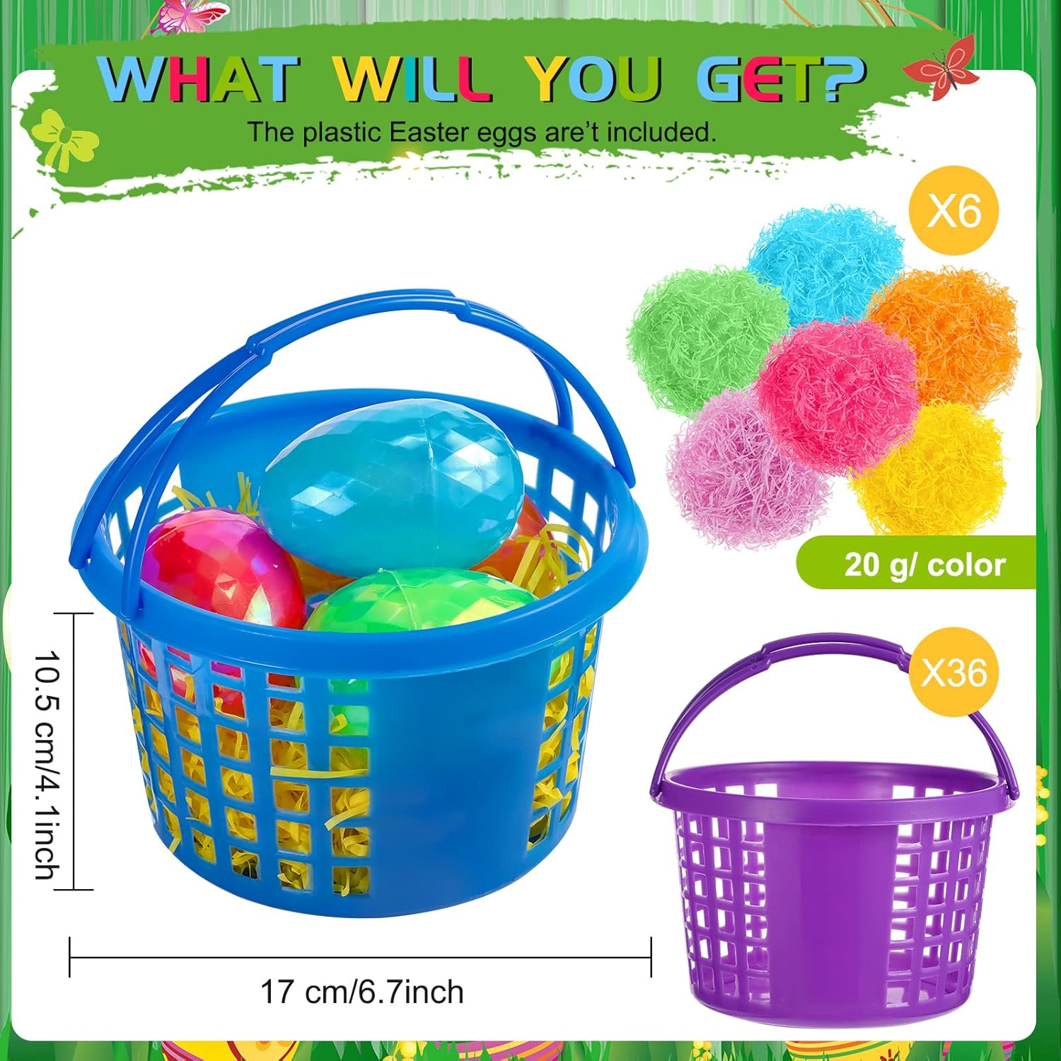 • Rich in Choices: the package comes with 36 pieces of plastic Easter baskets in 6 colors (pink, yellow, orange, green, blue, purple), and equipped with the corresponding color of Easter grass, a total of 120 g, sufficient number and rich color can meet your Easter decoration needs and sharing needs